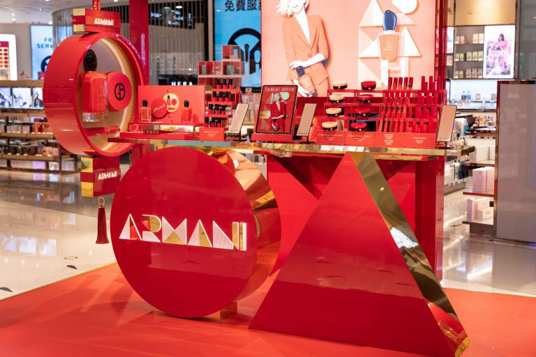 A bold, sculptural Chinese New Year display by Giorgio Armani uses lacquered red finishes, geometric forms, and gilded accents to dominate the retail floor. The setup reinforces the gifting mindset of the season while marrying luxury branding with festive symbolism.