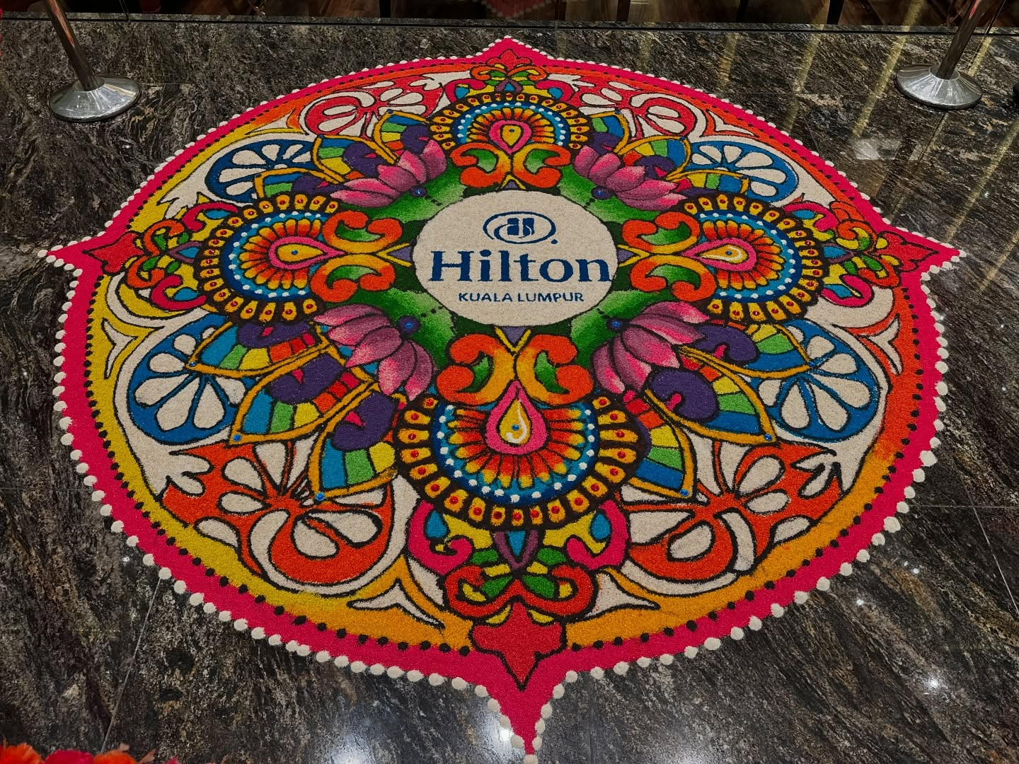 A meticulously crafted Deepavali kolam welcomes guests at Hilton Kuala Lumpur, blending vibrant traditional patterns with brand identity. The hotel logo sits seamlessly at the heart of the design, turning a cultural art form into a memorable brand moment.