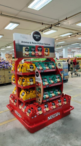 At supermarkets, large brands like Nestlé or Milo often place standees or pallet displays just past the entrance, often near the promo section. These catch the eye before a shopping list kicks in.