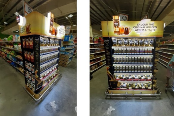 FMCG brands like Nescafe or Maggi regularly book endcap displays, often paired with banners, and LED shelf strips.