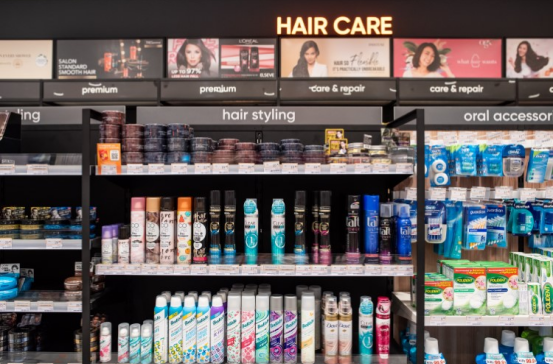 The hair care aisle is a great example. Each section is distinctly framed with headers like “premium,” “care & repair,” and “hair styling,” offering a clear mental map for shoppers. Products are further segmented horizontally and vertically by use case and format, from sprays to waxes to dry shampoo.