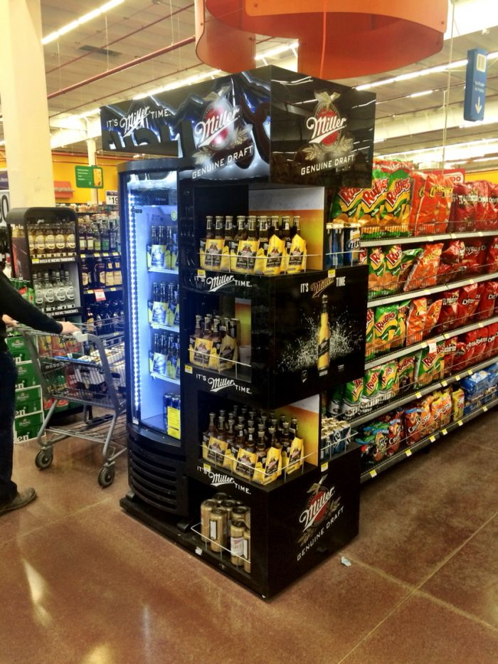 Case in point: A tall, tiered display that lifts hero products above the shelf line. The extra height breaks the shopper’s usual left-to-right scan, making key items feel more important and easier to notice.